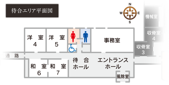 エントランスホールから待合ホール(無料)と、待合室として和室と洋室がそれぞれ2室ずつ、法要室が3室ございます。それぞれ、初七日、法事にご利用可能なレイアウトとしておりますのでご利用者様のニーズにあった使用が可能になります。